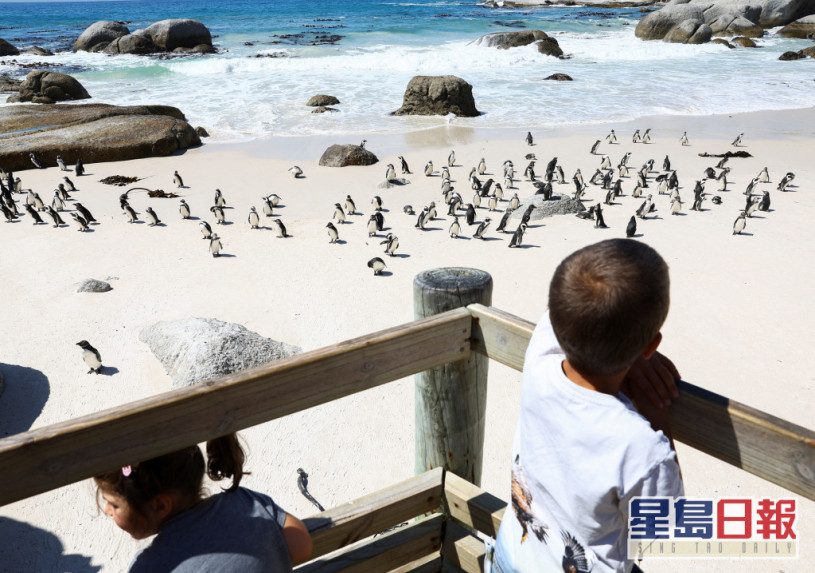 小朋友正在開普敦著名的企鵝棲息地觀景點觀看非洲企鵝。路透社圖片
