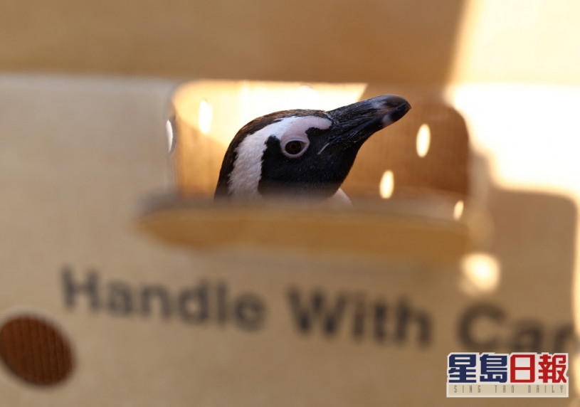 一隻受傷後非洲企鵝的安放在一個盒子。路透社圖片