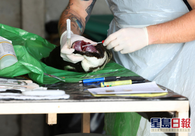 南部非洲海岸鳥類保護基金會(SANCCOB)人員準備剖開非洲企鵝屍體。路透社圖片