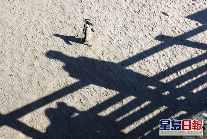 一隻非洲企鵝在著名的博爾德斯企鵝棲息地的海灘上行走。路透社圖片