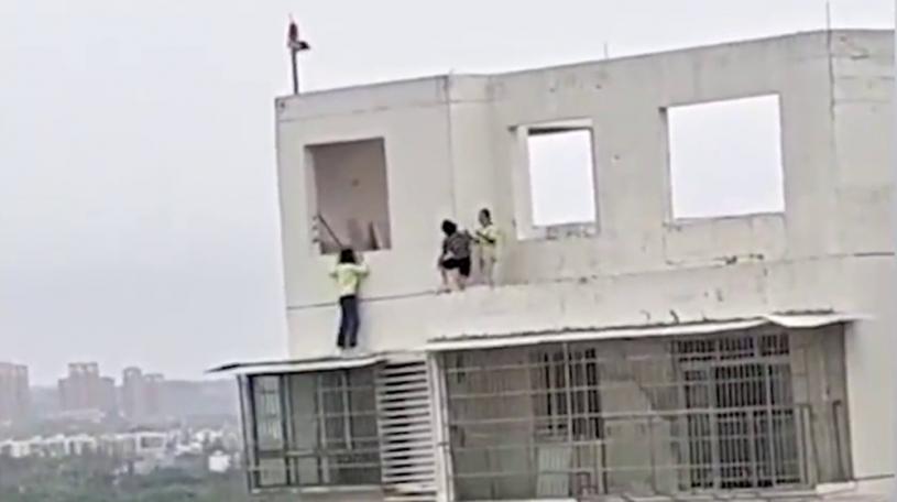 在四川遂寧,網傳影片顯示3名女孩在民居天台玩耍,飛簷走壁,驚險萬分,其中一女孩更翻越護欄踩遮雨棚行走,還有女孩坐護欄外雙腿懸空,一點防護都沒有。