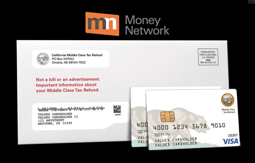以電子方式提交2020年加州納稅申報表,並透過直接存入帳戶方式收到加州政府退稅的合格納稅人,退稅直接存入帳戶。其他人則以借記卡形式收到退稅,信封上顯眼地明示:「這不是帳單或廣告,而是有關您的中產階級退稅的重要訊息。」