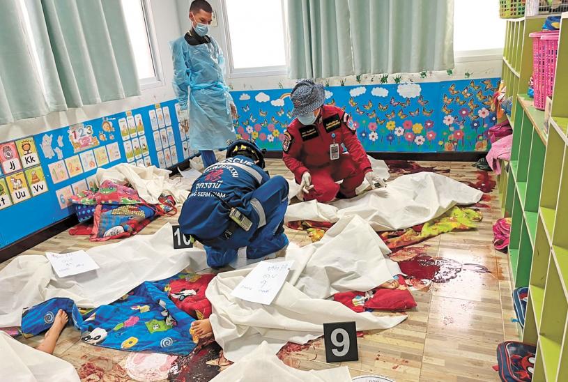 泰國東北部6日發生嚴重槍擊血案,一名前警員闖入當地一所幼兒園大開殺戒,持刀攻擊和開槍濫射,隨後逃離現場,返家殺死妻兒後自盡。事件中有至少38人死亡,包括24名幼童,警方稱,行兇的前警員早前因管有毒品而被革職,事發當日早上曾出庭就控罪應訊。這是泰國歷來釀成最多人死亡的槍擊血案。