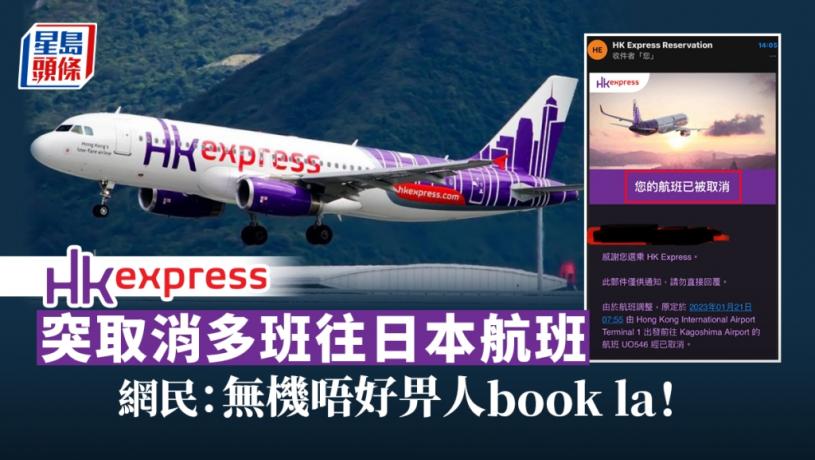 有網民今日於連登討論區發文,指下午收到香港快運的郵件通知,指由於航班調整,原定在1月21日上午7時55分,飛往鹿兒島機場的UO546航班被取消。他截圖作證明,指香港快運提供4個選擇給他,包括更改原定航線之出發日期、更改至其他香港快運航線、以代金券形式退款及退回整張訂單或受影響之航段的款項,其中條款提到若更改原定航線之出發日期或目的地,可以免費更改一次,而代金券有效期則為一年。該名網民大呻「無機唔好畀人book la」。