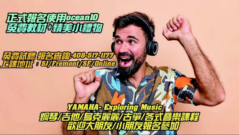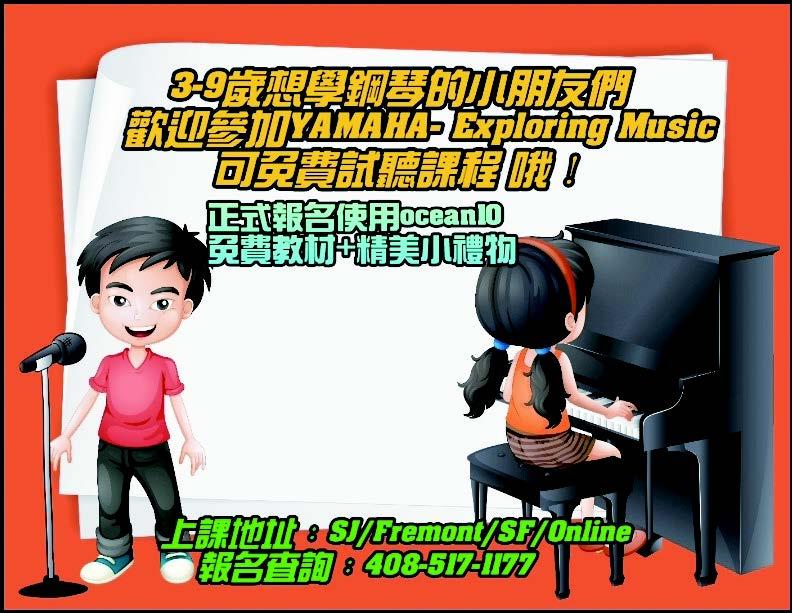 Exploring Music 雅馬哈音樂學校,課程豐富多元,有最適合小朋友的音樂課,有最會教小朋友的專業老師,有最全面的綜合音樂教程。用各種有趣的方法,學習豐富的音樂內容,團體班中快樂學習,彈琴,唱歌,創作并分享音樂,從而培養附有感性的心靈。另外還有各種樂器的一對一課程。不論小朋友還是大朋友,學音樂就在雅馬哈音樂學校。三個校區:聖荷西,舊金山,Fremont, 實體課,還有网課方便您學習。查詢及報名電話: 408-5171177,10/8星島工展會攤位E5 ,歡迎大朋友,小朋友現場報名,到時見囉!