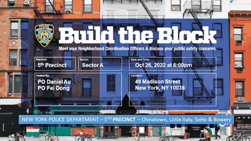 為增強警民間互動交流,令民眾及時了解社區治安狀況,同時令警方及時獲取民眾所發現的治安相關問題及隱患,紐約市警5分局A區將於下周三(26日)召開「構建社區」(Build The Block)警民會。歡迎轄區民眾參與,與警員及其他社區民眾共同就轄區內目前的治安有關問題進行交流。