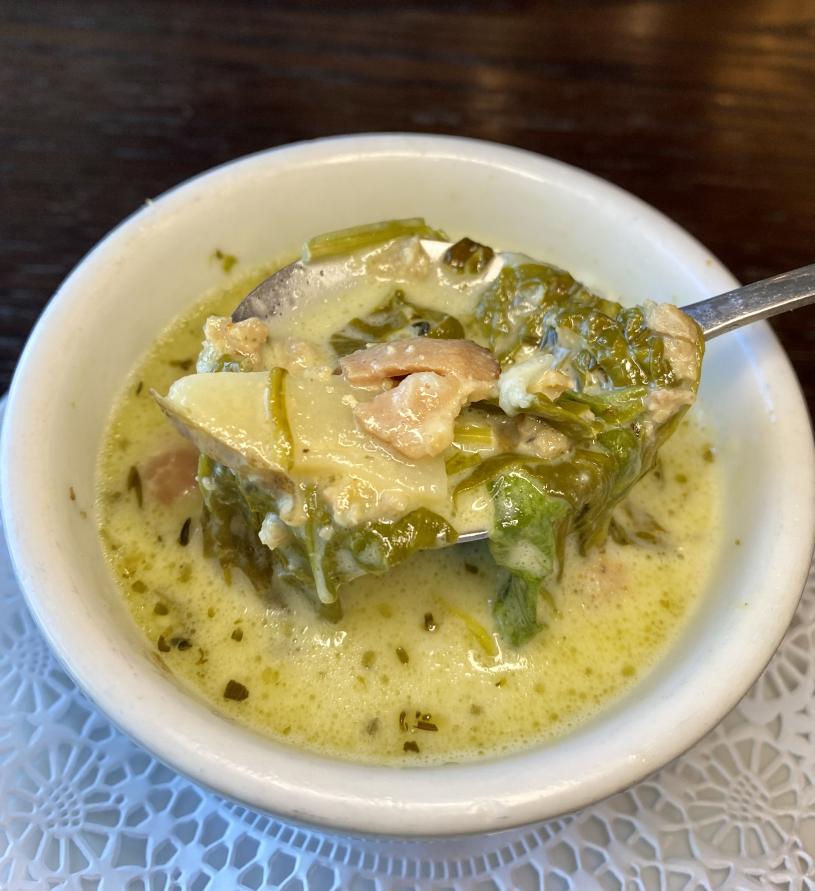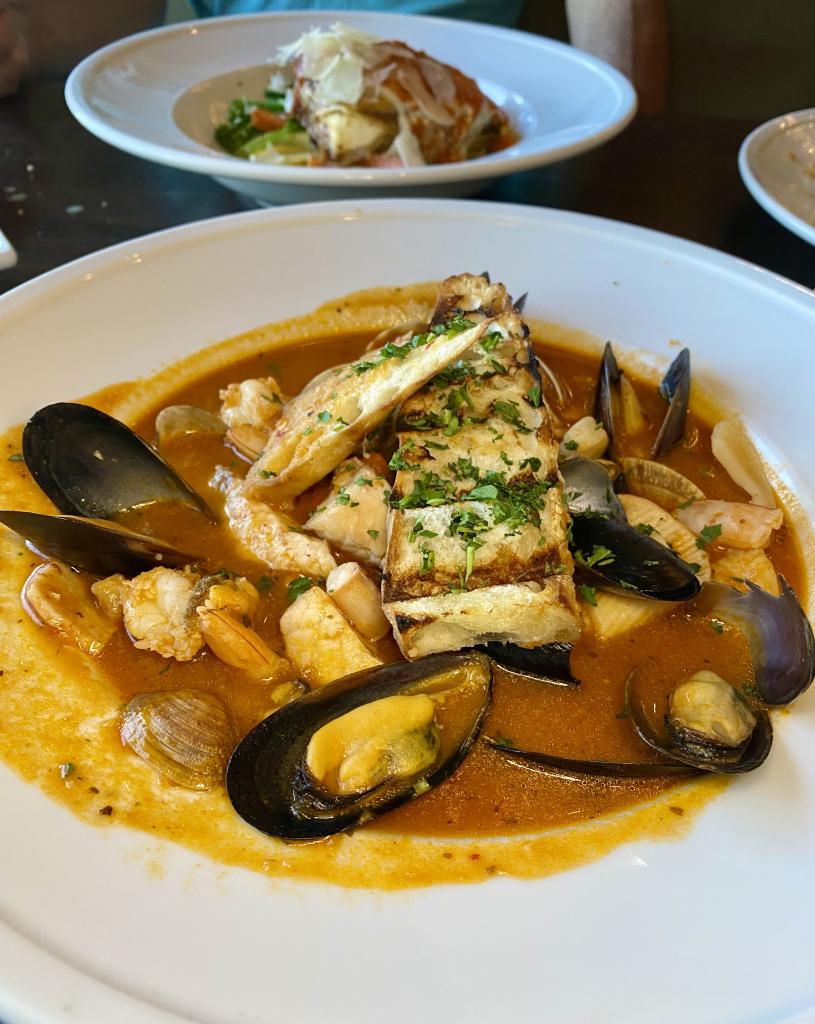 主菜的海鮮大燴材料豐富。蕃茄湯底中有魚肉,大蝦,黑青口,