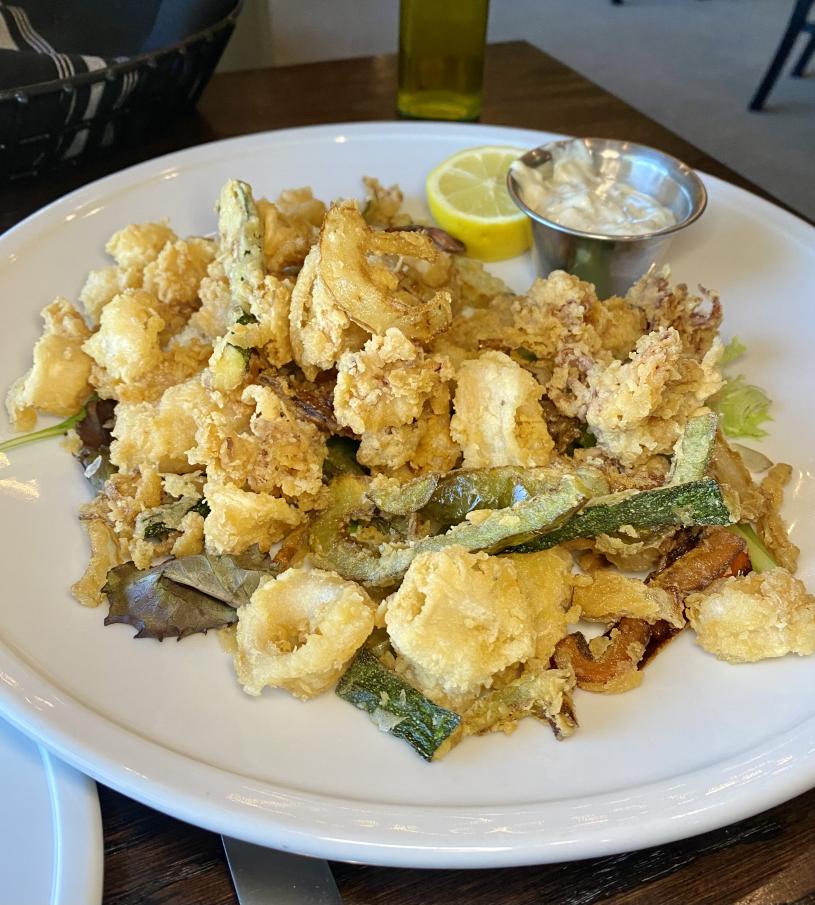 酥炸魷魚中加了炸蝦和炸紅綠燈籠椒。