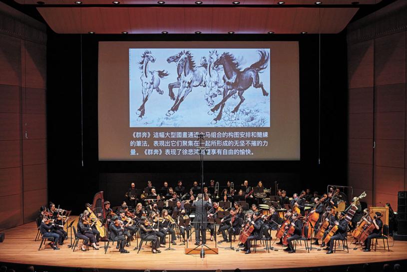 最後壓軸上演的是作曲家黃安倫為本屆紐約中國當代音樂節最新創作的交響詩《徐悲鴻畫境隨想曲》,樂曲分為兩部分,靈感分別來源於徐悲鴻的油畫《蕭聲》和國畫《奔馬》。