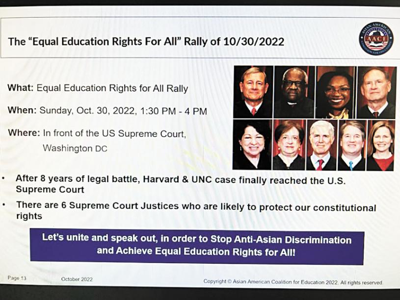 趙宇空表示,哈佛大學及北卡大學的收生歧視訴訟案已延續多年,現在已去到美國最高法院,亞裔必須要團結爭取權益,數字已充分顯示,亞裔的SAT分數需要比白人高140分,比西裔高270分,比非裔高450分(滿分1600分)才能被這些學校錄取。這對亞裔學生極為不公平。