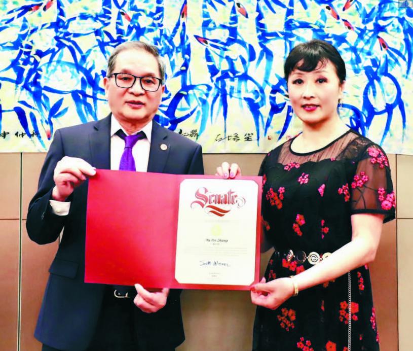 主辦方舊金山國際商務獅子會會長張春梅致詞,首先代表商會歡迎大家蒞臨的同時並致衷心感謝!她指出,為了在海外弘揚中華文化,所以舉辦這場有意義的慶會。