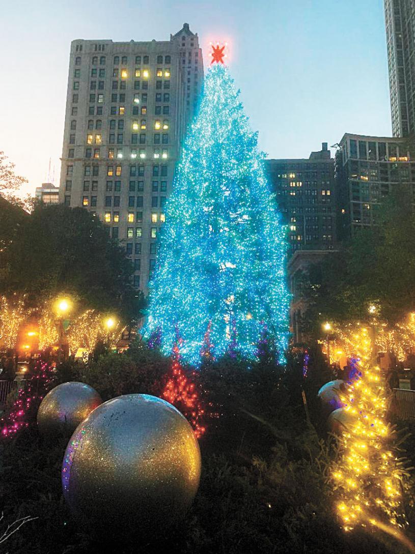 象徵芝加哥市官民啟動慶祝聖誕節降臨的高大聖誕樹,布置上百萬盞五彩繽紛、華燈絢麗的彩燈的矗立在千禧公園前庭、面對華盛頓大道。11月18日晚,芝加哥市府舉行點亮第109届聖誕樹儀式,就是代表芝加哥民眾啟動慶祝普天同慶的佳節的降臨。