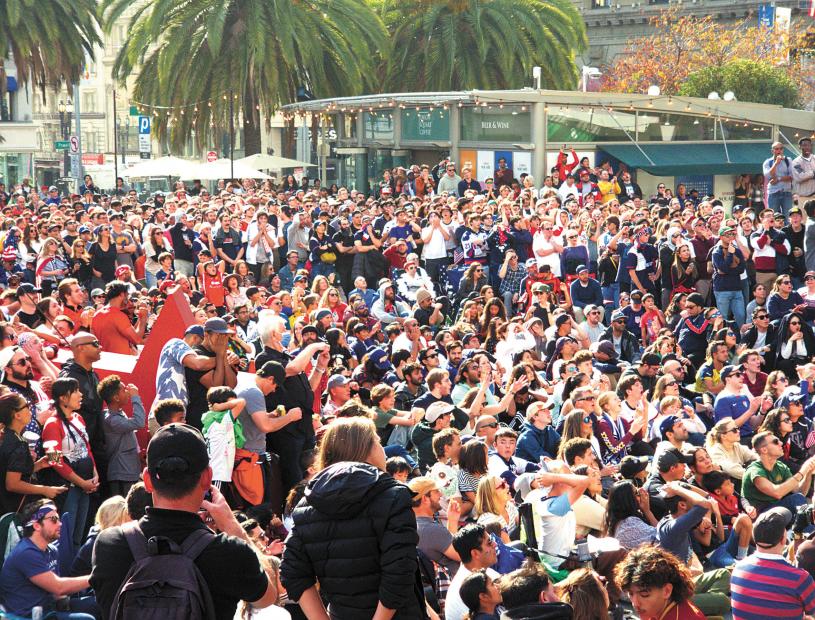 昨日正值黑色星期五,聯合廣場人山人海、人頭湧湧,聯合廣場被球迷簇擁得水洩不通。聯合廣場沒有椅子,前排的球迷們全部自帶野餐毯鋪地,坐地觀看大屏幕賽況,後排觀眾站立在各種地方。所有人聚精會神觀看比賽,隨著賽況變化而振臂歡呼。接下來兩天主辦方會繼續在聯合廣場舉辦觀賽派對。