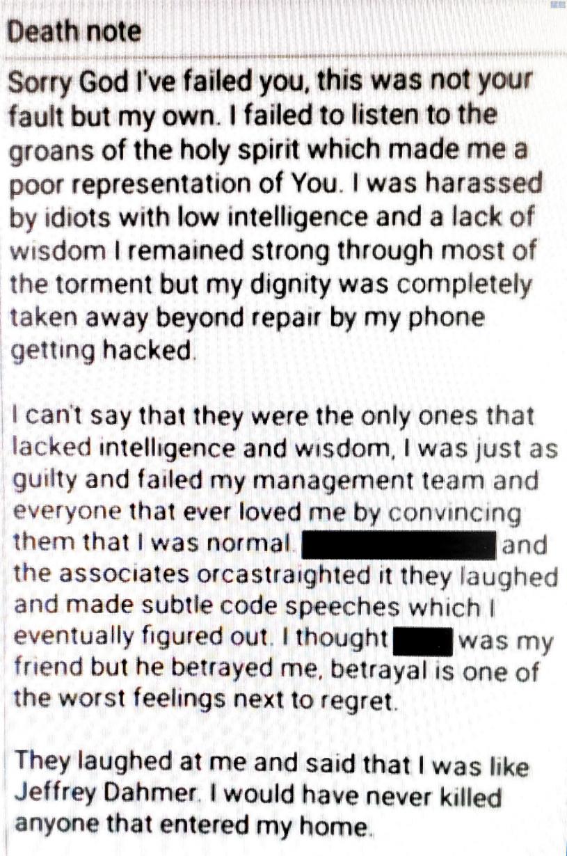 賓格的字條共有11段,思路相當混亂,其中談到癌症非傳統療法,又說他會作曲,並指責同事將他比喻成1970至90年代的變態連環殺手丹墨,寫著「我絕不會殺死闖入我屋子的人」。丹墨在1978至1991年間共殺死、肢解17名男子,被稱為「密爾沃基食人魔」,其故事經電視台拍成紀錄片。
