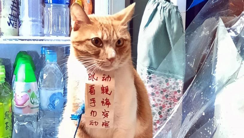 貓店長可愛人人得以摸之,但深水埗一報紙檔的貓店長可能太受歡迎而應接不暇,檔主唯有出絕招替貓咪掛上口水肩,白底紅字提醒路人「眼看手勿動,動親褲穿窿」。對於「眼看手勿動」,有其他貓店長員工之前曾發出「心聲」講解,指貓咪需要睡眠,不停招呼客人便無法休息。