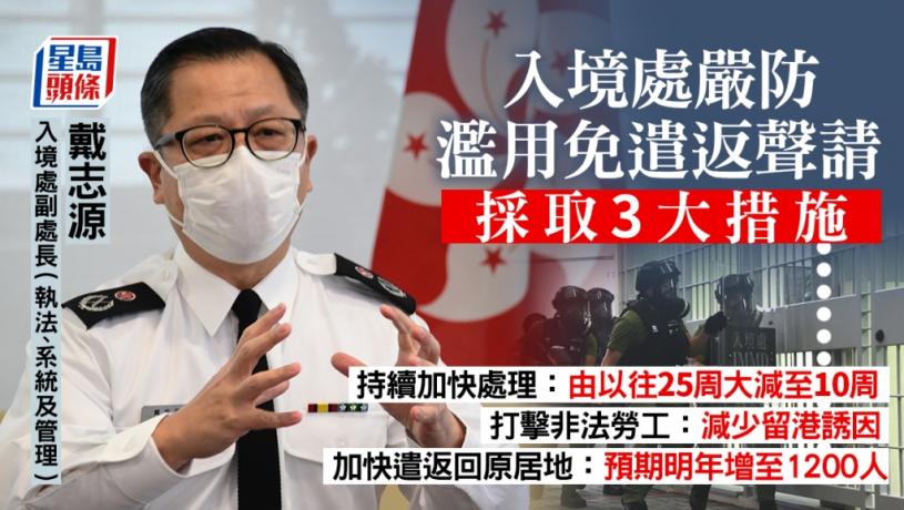 大批聲稱在母國遭受酷刑而前往香港提出免遣返聲請、以南亞裔為主的人士滯留香港,多年來為本港帶來不少經濟負擔,並衍生治安和非法工作「搶飯碗」等社會問題。入境處副處長(執法、系統及管理)戴志源表示,該處為解決這個困擾多年的問題,近年加快審核免遣返聲請個案,令處理每宗個案的時間由過往25星期大減至10星期,惟大部分被該處拒絕的聲請人會多番上訴,導致上月底仍有近15000人留港,該處會持續打擊包括聲請人在內的非法勞工,以減少眾人留港誘因,並加快遣送聲請不獲確立人士返回原居地,期望未來能進一步加快遣送,達到「出大於入」。