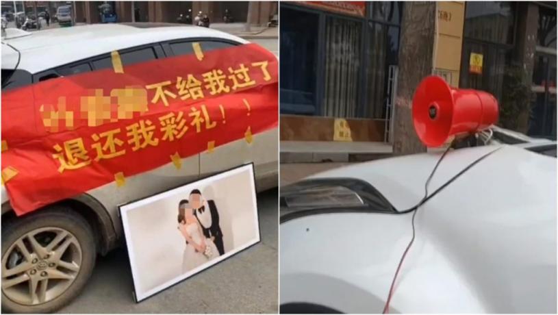 河南省駐馬店市一名25歲男子,日前在座駕掛橫額,駛到到妻子娘家的小區,開喇叭要求退還18萬元人民幣禮金。據內媒周日(27日)報道,男子為了娶妻,東拼西湊51萬元人民幣禮金,終於取得「美人歸」,惟二人婚後33天,女方突然跑回到娘家,指二人開始分居,但女方不同意離婚,亦表示不會回男家。男子於是提告,惟女家母親則指男子的說辭並非完全屬實,結果有待法院判決。事件引起網民熱議。