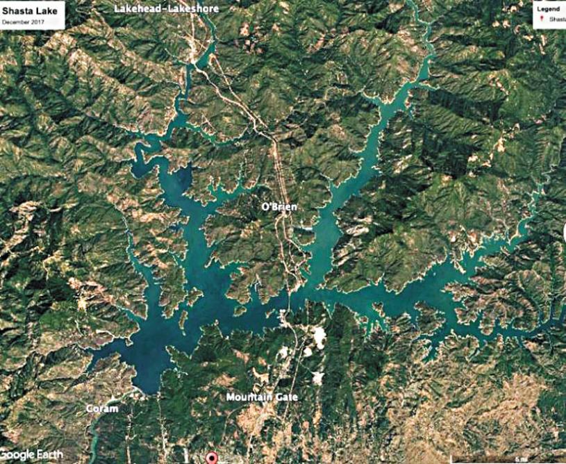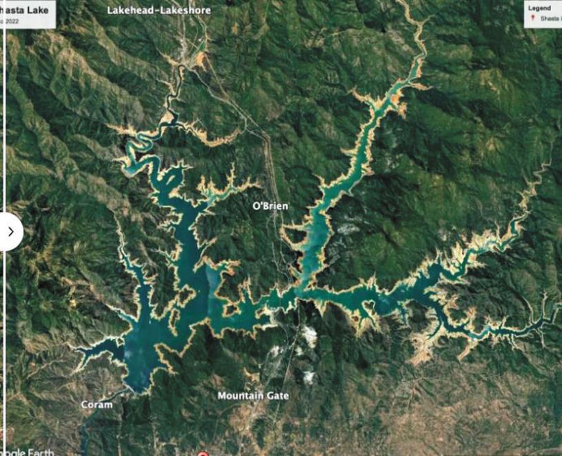 位於沙斯塔縣的沙斯塔湖為加州最大的水庫。2017年和2022年衛星圖像顯示,隨著湖水退去,海岸線間存在明顯差異,目前水量僅達正常值的百分之31。