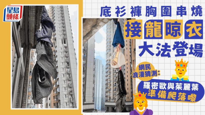 香港地晒衫難,市民的晾衣妙計如騙徒手法般層出不窮。最新的底衫褲「接龍晾衣」大法近日在網上瘋傳,網民都研究這種如火燒連環船的底褲、胸圍「一抽二褦」晒法是否較易乾。