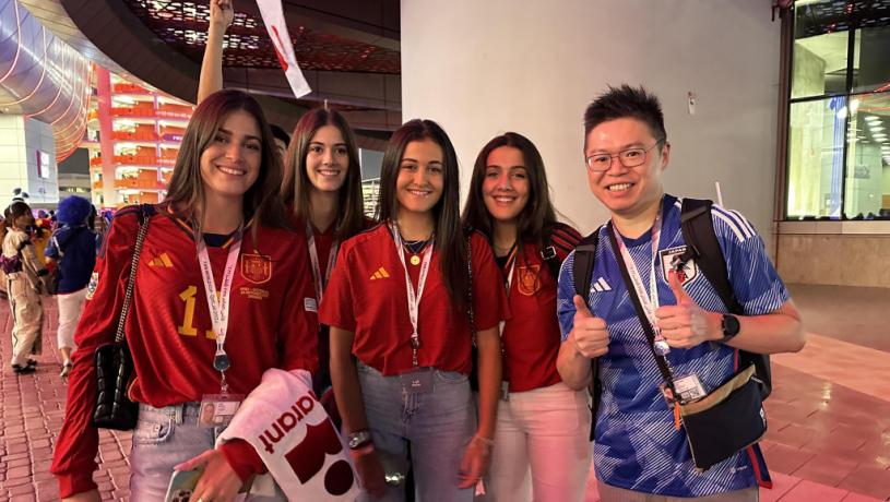 球場外,日本球迷的打扮永遠不會令人失望,但西班牙美少女亦引人注目,剛巧碰到來自香港的球迷Eric,與他們合照之餘,還傾談了一會,Eric今次來多哈將觀看三場賽事。觀眾席上西班牙球迷佔多數,但日本球迷輸人唔輸陣,在看台繼續大唱應援歌,聲勢撼贏對手。