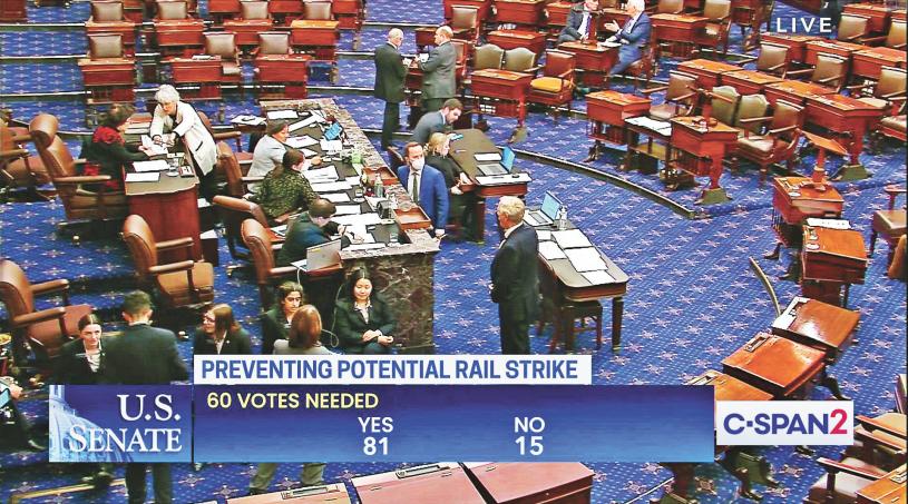 參議院1日迅速回應總統拜登的呼籲,繼眾議院放行一天之後通過鐵路薪酬法案,要求勞資雙方必須遵守月前達成的協議,化解了迫在眉睫的貨運鐵路罷工危機。雖然拜登形容,法案能讓國家避過工潮帶來的經濟衝擊,但反對陣營批評,條文只增加了工人薪酬,並沒有順應工會要求增加有薪病假的天數。
