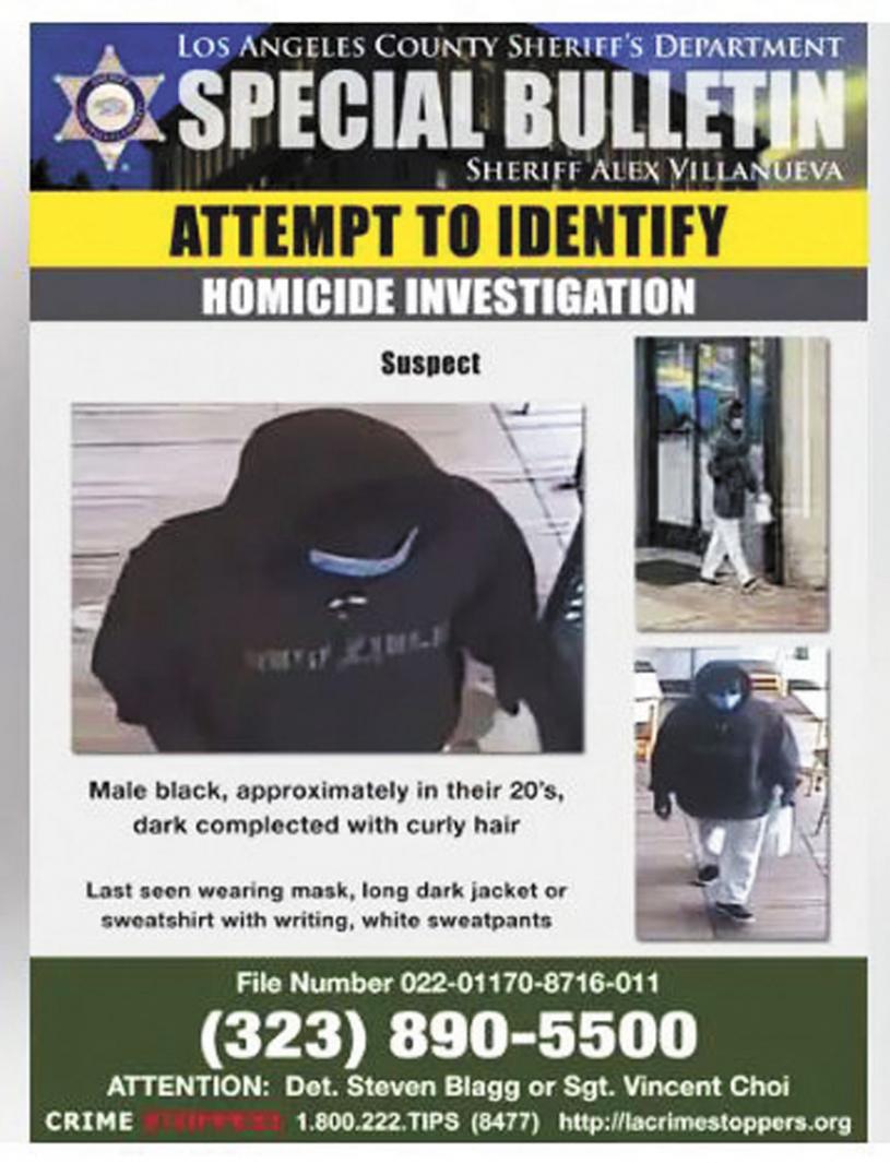 有此案相關線索者請電洽洛縣縣警局兇殺案組:(323)890-5500,或致電滅罪專線:1-800-222-8477。洛杉磯訊