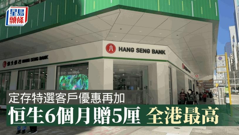 恒生公布,向特選客戶推出特別定存優惠,6個月達5厘,以敘造10萬元定計,到期後袋2500元利息;今輪亦增設特選客戶3個月定存優惠,有4.8厘,息率僅次於有提供5厘的建行亞洲,敘造10萬元定存,在到期後有1200元利息。值得留意是,特選客戶的優惠不限於新資金,連續期也享有該回報。