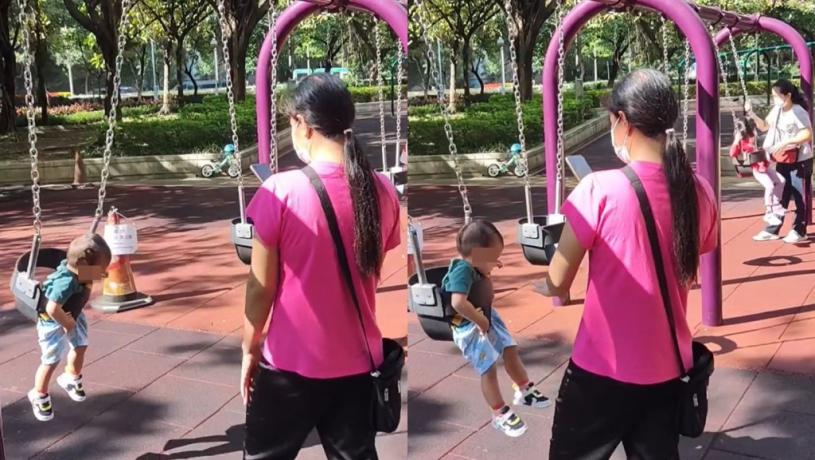 網民日前在社交網站facebook專頁「香港僱主討論區(外傭/鐘點/陪月/本地ee)」上載在將軍澳寶康公園拍攝到的短片,並留言指「吊住係到都係咁推,玩電話又唔理個小朋友,真係自己有時間自己湊返啦」。