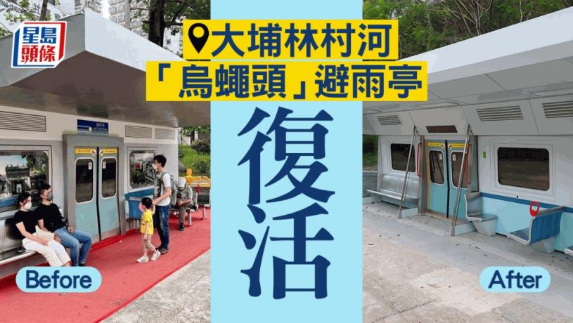 位於大埔林村河畔的「烏蠅頭」列車車廂造型避雨亭,在10.1國慶日開放一個月後,至11月3日開始圍封加裝環保設施。民政事務總署至周四(12月1日)在社交平台表示,避雨亭於周三(11月30日)已完成改善工程,重新開放。