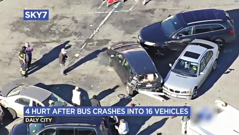 帝利市(Daly City)塞拉蒙特購物中心(Serramonte Center)周五(2日)嚴重車禍,聖馬刁縣巴士局(SamTrans)一輛巴士因故失控,連環撞毀停車場內最少16輛車,造成最少4人受傷。
