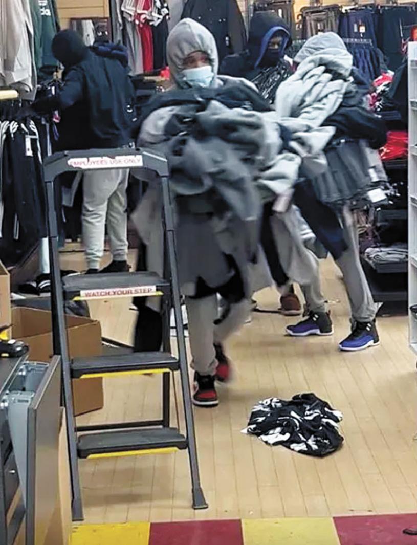 警方公布的照片顯示,多名嫌疑人在洗劫一家運動服飾店時,身穿連帽運動衫並戴著口罩。當他們衝出商店時,可以看到多名竊賊手中都抱著一大堆衣服。