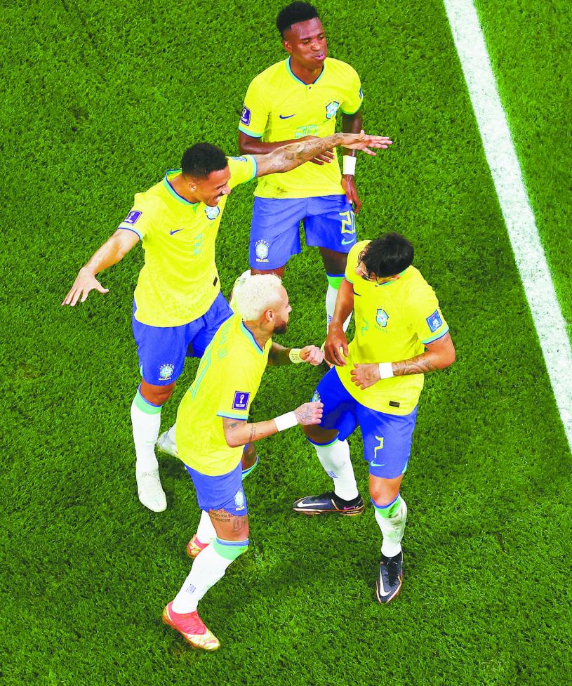 每進一個球就換一支舞,上半場37分鐘內四次輕舞飛揚——5日的16強賽,巴西把974球場變成了熱情似火的大舞台,多點開花的森巴軍團4:1輕取「太極虎」韓國,晉級8強。球員們盡情扭動著舞姿,甚至主帥蒂特也跟著嗨了起來。