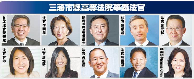 除了民選官員職位之外,選民還會投票選出三藩市加州高等法院法官。目前52個在職三藩市高等法院法官中,有9位是華人,其中三位女性六位男性。華人占比不到五分之一。包括首席法官黃宏威(Garrett Wong)、助理首席法官馮曙光(Samuel Feng)、李明美(Cynthia Lee)、法官鄭元松(Andrew Cheng)、陳啟煌(Bruce Chan)、林萍(Rita Lin)、唐加玲(Michelle Tong)、黃正凱(Victor Hwang)、陳羅傑(Roger Chan)。黃宏威與馮曙光分別於2019年擔任高等法院首席和助理首席法官,是全美司法界歷史上首次出現兩華裔同時擔任高等法院兩個高職。高等法院還有一位韓裔女法官Marisa Chun。