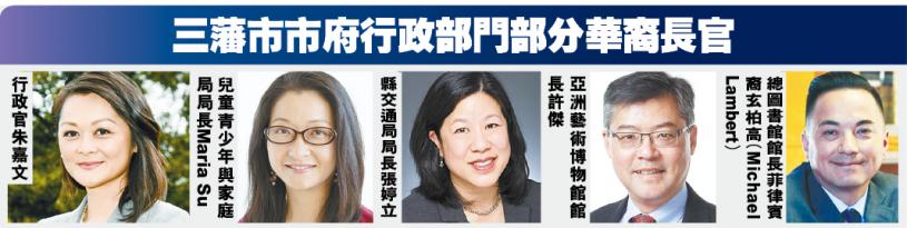 三藩市市府共有93個行政部門,包括市府委員會等。這當中有幾位華裔擔任較為重要的部門長官。首先是前日落區市參事、前估值官朱嘉文(Carmen Chu)現擔任市府行政官;三藩市縣交通局局長張婷立(Tilly Chang); 亞洲藝術博物館館長許傑(Jay Xu);三藩市兒童青少年與家庭局局長Maria Su。而其他亞裔擔任其他要職的還有三藩市總圖書館館長菲律賓裔玄柏高(Michael Lambert)等。