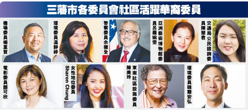 目前三藩市共有102個委員會,近千位委員,80多位為華裔,占比將近9%。各市府委員通常是各個領域的菁英人士,受到市長的任命下擔任,為非全職職位。這些職位雖然並非民選官員,但卻直接關係到各個具體部門的初級立法以及服務,許多市參事會的法律最初是需要在委員會通過,因此委員們對社區影響也非常重大。