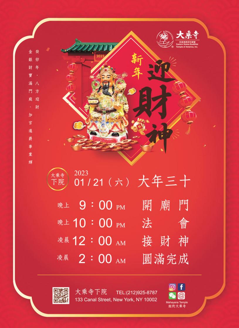 金銀財寶滿門庭,加官進爵事業興,癸卯年新春將於本月二十二日蒞臨,紐約大乘寺下院將於農曆大年三十(1/21)深夜至農曆年初一(1/22)凌晨舉行連串新春迎財神法會,歡迎各界善信蒞臨迎接財神,同沾法喜。