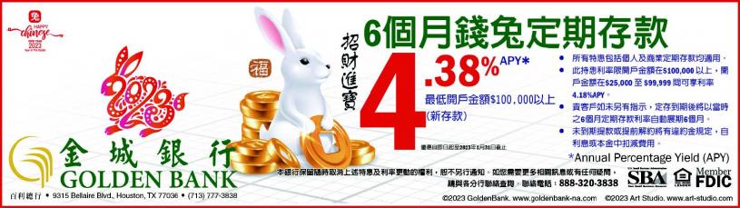 金城銀行在兔年開春即刻宣告喜訊,北加州佛利蒙分行(Fremont)即將於2023年2月份正式營業。金城銀行過去數年除了設立多個新服務據點,升級及更新核心作業系統,各項營運成果和財務報告更是亮眼。金城銀行2022年總資產額15億3仟萬美元,稅後淨利2仟5佰萬美元;放款總 12億5仟9佰萬美元,存款總 12億7仟4佰萬美元;資產報酬率(ROA) 為1.77% ,股東權益報酬率(ROE) 為13.33%。金城銀行2022年業務表現穩健成長,希望更能擴展銀行的服務層面。為慶祝農曆新年,金城銀行特別推出6個月定期存款,年利率4.38%APY, 如您需要更多相關訊息或有任何疑問,歡迎與各分行聯絡查詢。