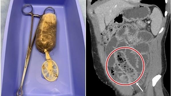 美國愛荷華大學醫院與醫學院專家近日分享一起腸阻塞的罕見病例,一名34歲男子因腹痛、噁心、嘔吐掛急診,坦承自己在「荷爾蒙爆發」之下誤吞一根被保險套包住的香蕉,導致超過24小時無法排便,也因劇痛無法忍受任何食物下肚。醫生開刀從小腸完整取出一個打結的保險套,發黑內容物已看不出香蕉原型。
