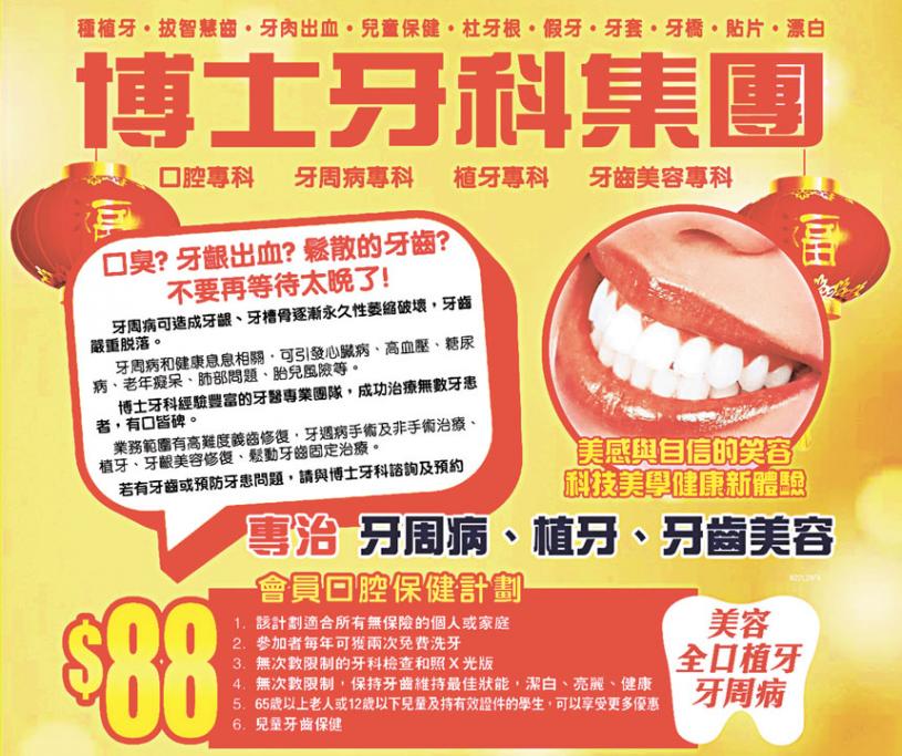 博士牙科集團各大專科, 為顧客提供綜合普通科和專科牙科服務,擁有最强大的牙科團隊為你定做一個健康亮麗的笑容。博士牙科服務範圍: 口腔專科、牙周病專科、植牙專科 、牙齒美容專科。包括:種植牙、拔智慧齒、牙齦出血、杜牙根、假牙、牙套、牙橋、貼片、漂白等。