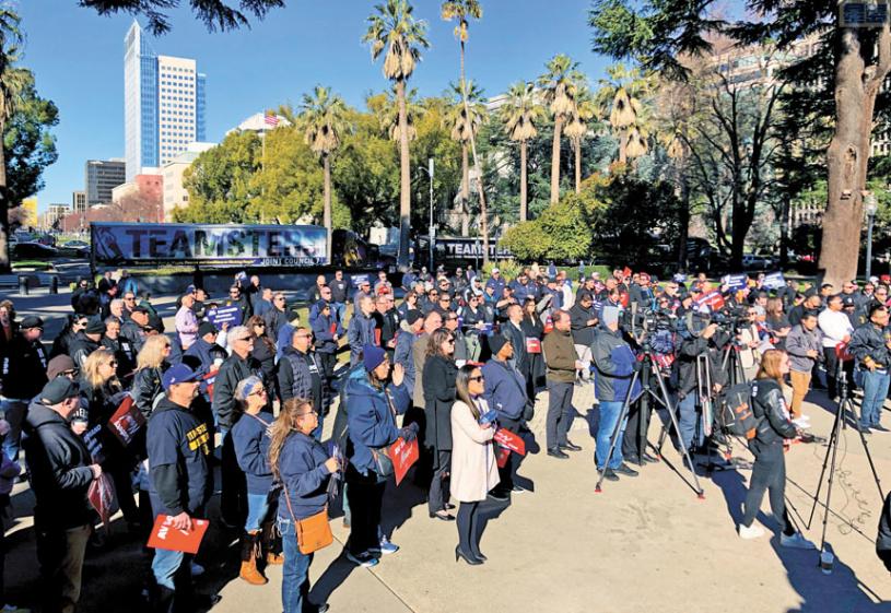 民主黨州眾議員阿古亞-庫里(Cecilia Aguiar-Curry)本周宣佈提出法案,規定所有無人貨櫃車需有真人司機進行監管時,逾百名國際貨櫃車司機工會(IBT)會員陪伴出席記者會。
