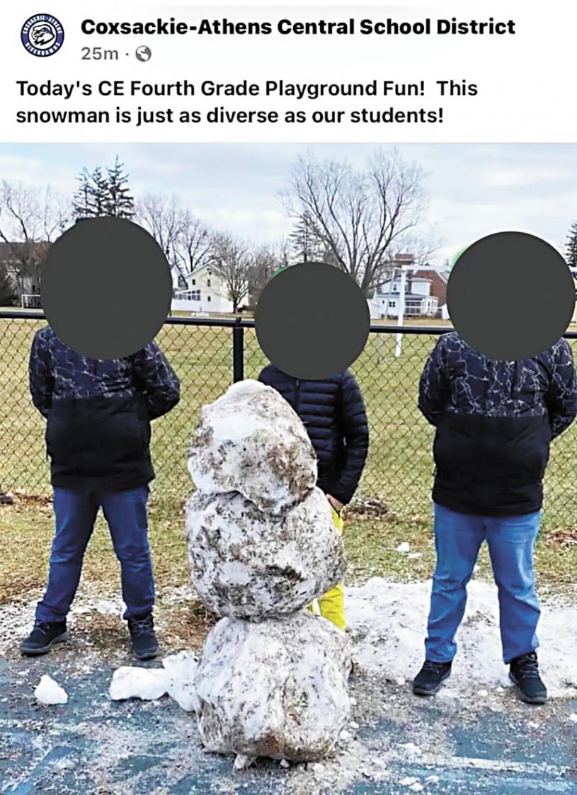 紐約上州一個學區在臉書上發帖,稱讚4年級學生製作的髒雪人「多元化」遭受批評。