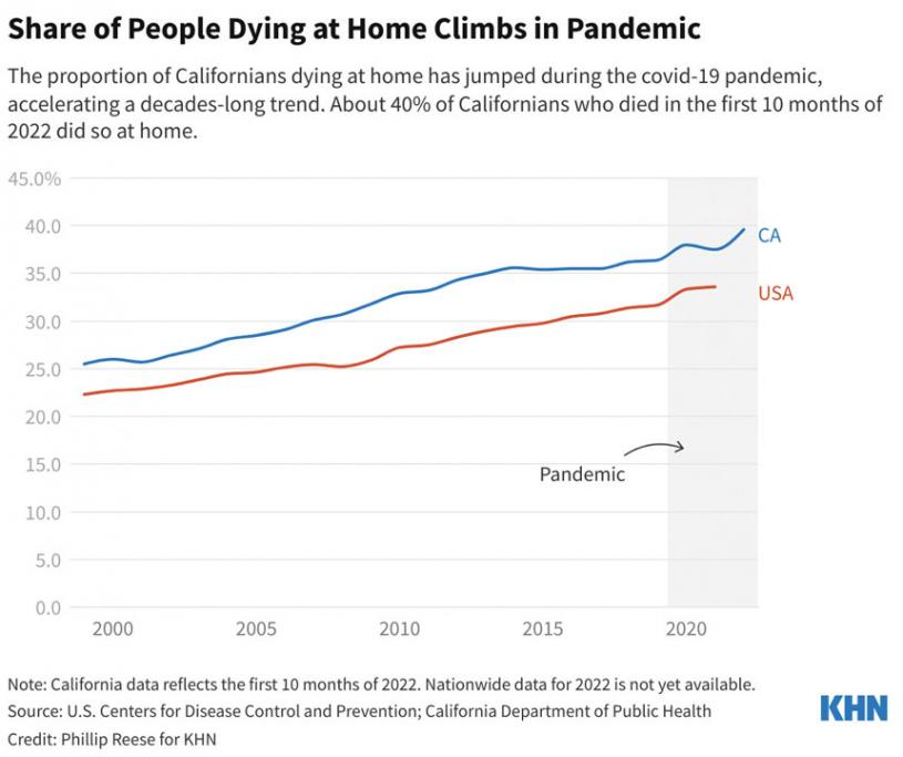 橙縣紀事報(OC Register)報道,新冠疫情促使加州人死於家中而非醫院或療養院的比例激增。根據加州公共衛生部的死亡證明數據,2022年前10個月,加州近 40%的死亡發生在家中,高於2019年全年的約36%,而在1999年只有26%的加州人死於家中。