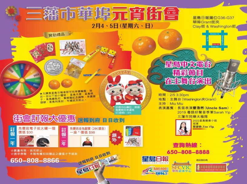 這次的元宵街會繼續在華埠的都板街(Grant Ave)舉行。希望三藩市的居民,華埠的商戶和外地的遊客能夠在元宵街會上感受中國傳統文化魅力與喜慶活躍的節日氣氛,和支持華埠的小商家。讓星島為繁榮華埠作出一份努力,歡度一個熱鬧、溫馨、愉悅的元宵佳節。