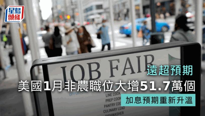美國公布,1月非農就業人口51.7萬個,遠高於市場預測的18.5萬個,為去年7月以來最大增長。而失業率為3.4%,低於預期的3.6%。
