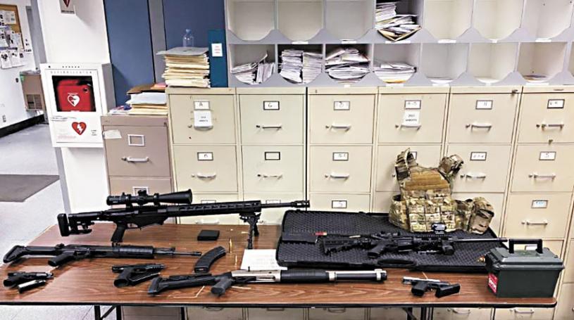由警方公布的一張照片顯示,桌子上擺滿武器和彈藥,包括幾把長槍、帶彈匣的手槍和迷彩圖案的防彈衣。