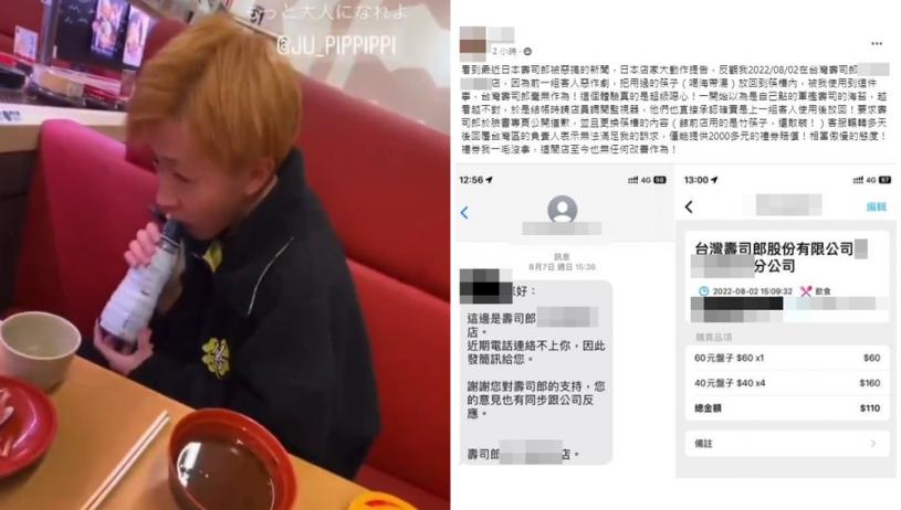 台網民在Facebook專頁《爆料公社》發文表示,他2022年8月2日到台灣壽司郎台北某分店用餐時,發現筷子上有海帶渣,還以為是自己點的軍艦壽司的紫菜,但用餐完畢後越想越不對勁,結帳時要求店員調閱閉路電視,這時才發現超噁真相,前一組客人竟喝完海帶湯後,又將筷子放回筷槽。