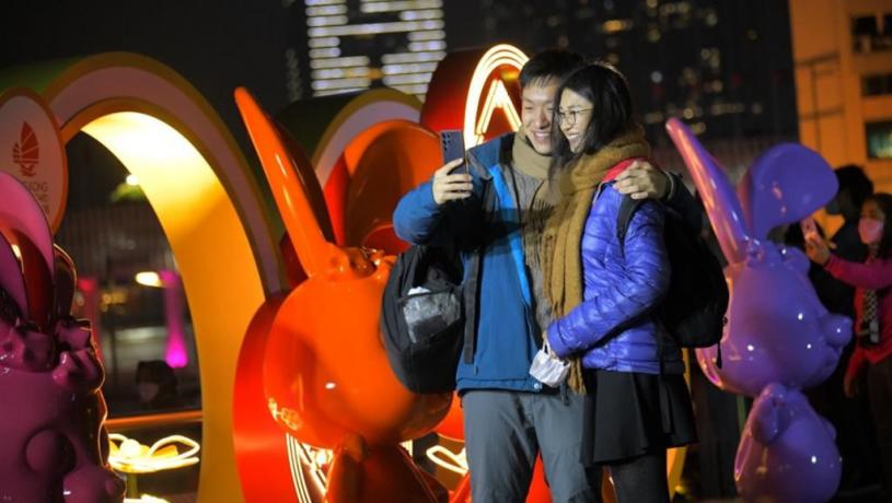 古代的男女會趁元宵節外出賞燈及猜燈謎,尖沙嘴文化中心露天廣場外的春節綵燈展《兔來運轉.花燈迎新禧》,便吸引了不少情侶到來賞燈並拍照打卡兼猜燈謎,共渡良辰美景,亦有市民一家大細到來,感受節日氣氛。