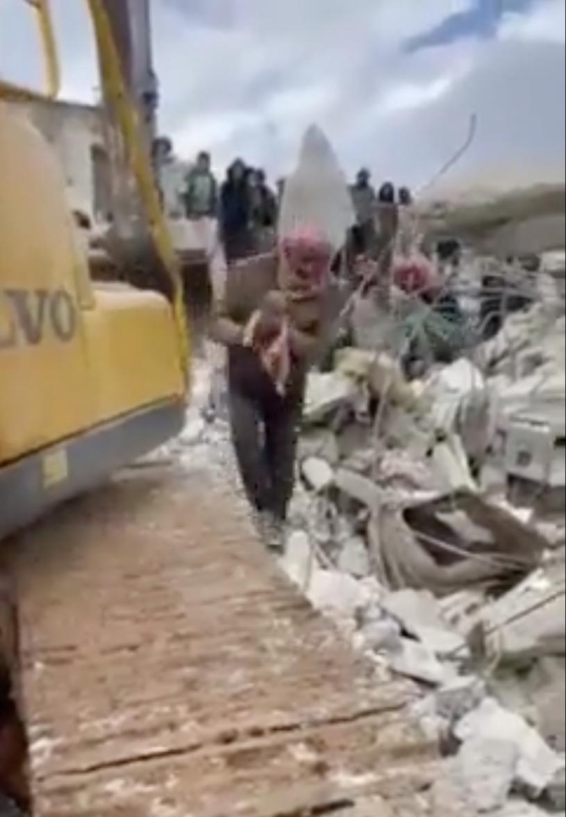 在這場震災中的地區,也出現死亡與誕生交織出現的情景。在社交平台推特上有人發布了一條影片,在一個滿目瘡痍的災場,一個看來剛從母腹出世、光着身子的小嬰兒被人從一部疑似挖土機中抱出來。不過發布者未有透露母親的情況。影片標示的地點在敘利亞阿勒坡,亦即今場大地震中的重災區之一。