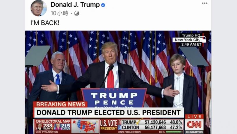 特朗普回歸Facebook,除簡短寫下「我回來了」(I’M BACK!),還附上一段2016年總統勝選感言的12秒影片,片中他說「抱歉讓大家久等了,事情有點複雜」。Youtube也是以「我回來了」為標題發布同一則影片。他的Facebook有3461萬人追蹤,Youtube則有268萬人訂閱。