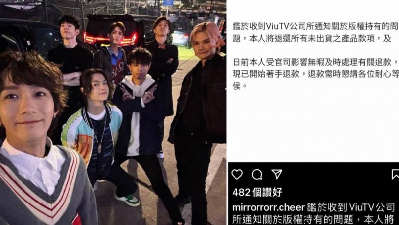 香港人氣男子組合MIRROR近日風波不斷!繼早前姜濤因為被指對哥哥張國榮不敬而公開平反之後,又發現Ian陳卓賢在林俊傑演唱會被嫌棄的風波,豈料一波未平一波又起,近日再有鏡粉專頁「mirrorrorr.cheer」表示收到ViuTV指其應援物品侵權事宜,他在其IG專頁寫道:「鑑於收到ViuTV公司所通知關於版權持有的問題,本人將退還所有未出貨之產品款項,及日前本人受官司影響無暇及時處理有關退款,現已開始著手退款。」並指「此Instagram帳號亦將於明日18號中午關閉」。